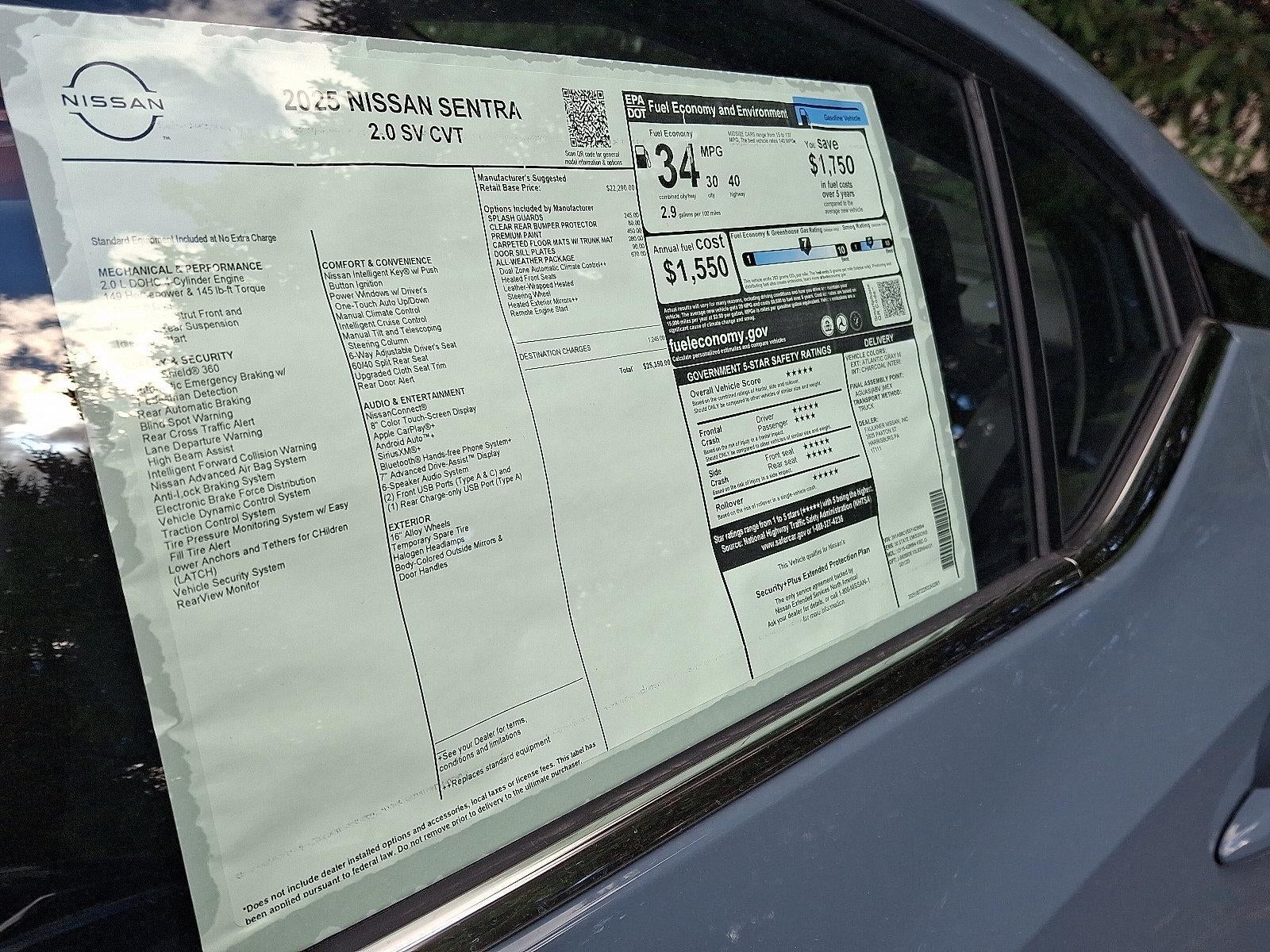 2025 Nissan Sentra SV 2.0L I4 DOHC *Schedule a test Drive at your home or office*, CVT with Xtronic, Charcoal Cloth, 16" Alloy Wheels, 4-Wheel Disc Brakes, 8 Speakers, ABS brakes, Air Conditioning, All-Weather Package, Alloy wheels, AM/FM radio: SiriusXM, Auto High-beam Headlights, Blind Spot Warning, Body Colored Splash Guards (4-Piece), Brake assist, Bumpers: body-color, Carpeted Floor Mats with Trunk Mat, Clear Rear Bumper Protector, Delay-off headlights, Door Sill Plates, Driver door bin, Driver vanity mirror, Dual front impact airbags, Dual front side impact airbags, Dual Zone Auto Climate Control, Electronic Stability Control, Four wheel independent suspension, Front anti-roll bar, Front Bucket Seats, Front Center Armrest, Front reading lights, Fully automatic headlights, Heated Exterior Mirrors, Heated Front Seats, Illuminated entry, Knee airbag, Leather-Wrapped Heated Steering Wheel, Low tire pressure warning, NissanConnect featuring Apple CarPlay and Android Auto, Occupant sensing airbag, Outside temperature display, Overhead airbag, Overhead console, Panic alarm, Passenger door bin, Passenger vanity mirror, Power door mirrors, Power steering, Power windows, Premium Paint, Radio data system, Radio: AM/FM with RDS/MP3/Aux-in, Rear anti-roll bar, Rear Parking Sensors, Rear side impact airbag, Rear window defroster, Remote Engine Start, Remote keyless entry, Security system, Speed control, Speed-sensing steering, Split folding rear seat, Steering wheel mounted audio controls, Tachometer, Telescoping steering wheel, Tilt steering wheel, Traction control, Trip computer, Upgraded Cloth Seat Trim, Variably intermittent wipers, CVT with Xtronic, Charcoal Cloth.