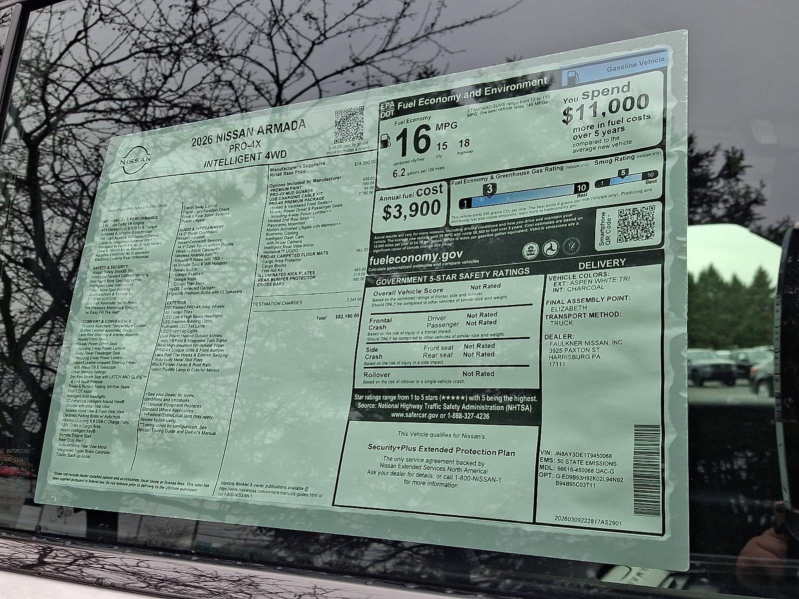 2026 Nissan Armada PRO-4X 3.5L DOHC *Schedule a test Drive at your home or office*, 4WD, 12 Speakers, 3rd row seats: split-bench, 4-Wheel Disc Brakes, ABS brakes, Adaptive suspension, Air Conditioning, Alloy wheels, AM/FM radio: SiriusXM w/360L, Anti-whiplash front head restraints, Apple CarPlay/Android Auto, Auto High-beam Headlights, Auto tilt-away steering wheel, Auto-dimming door mirrors, Auto-dimming Rear-View mirror, Auto-leveling suspension, Automatic temperature control, Biometric Cooling, Brake assist, Bumpers: body-color, Climate Controlled Heated and Ventilated Front Seats, Compass, Cross Bars, Delay-off headlights, Driver door bin, Driver vanity mirror, Dual front impact airbags, Dual front side impact airbags, Electronic Stability Control, Emergency communication system: NissanConnect Services, Four wheel independent suspension, Front anti-roll bar, Front Bucket Seats, Front Center Armrest, Front dual zone A/C, Front fog lights, Front reading lights, Fully automatic headlights, Garage door transmitter: myQ Connected Garage, Genuine wood dashboard insert, Hands-Free Power Liftgate, Heated 2nd Row Seats, Heated door mirrors, Heated Front Bucket Seats, Heated front seats, Heated steering wheel, HVAC memory, Illuminated entry, Illuminated Kick Plates, in-Car Camera, Intelligent Dash Cam, Intelligent Rear View Mirror (I-RVM), Knee airbag, Leather steering wheel, Low tire pressure warning, Memory seat, Navigation system: Google Maps, Occupant sensing airbag, Outside temperature display, Overhead airbag, Overhead console, Panic alarm, Panoramic Moonroof, Passenger door bin, Passenger vanity mirror, Power door mirrors, Power driver seat, Power Liftgate, Power passenger seat, Power steering, Power windows, Premium Paint, PRO-4X Carpeted Floor Mats with Bench Seat, Pro-4x Leather Quilted Insert Seat Trim, PRO-4X Mud Guards, PRO-4X Premium Package with Split Bench, Radio: NissanConnect with SiriusXM 360L, Rain sensing wipers, Rear air conditioning, Rear anti-roll bar, Rear Bumper Protector, Rear reading lights, Rear seat center armrest, Rear window defroster, Rear window wiper, Reclining 3rd row seat, Remote keyless entry, Security system, Speed control, Speed-sensing steering, Speed-Sensitive Wipers, Split folding rear seat, Spoiler, Steering wheel memory, Steering wheel mounted audio controls, Tachometer, Telescoping steering wheel, Tilt steering wheel, Traction control, Trip computer, Turn signal indicator mirrors, USB Charging Cables, Variably intermittent wipers, Voltmeter, Wheels: 20" x 8.5J Painted PRO-4X Alloy, 4WD.