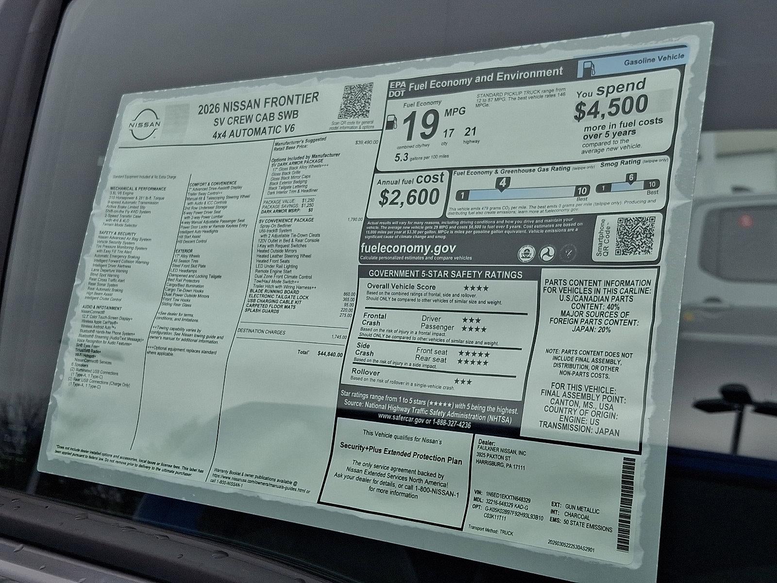 2026 Nissan Frontier SV V6 *Schedule a test Drive at your home or office*, 4WD, 120V Power Outlet in Bed, 120V Power Outlet in Rear Center Console, 17" Alloy Wheels, 3.692 Axle Ratio, 4-Wheel Disc Brakes, 6 Speakers, ABS brakes, Air Conditioning, Alloy wheels, AM/FM radio: SiriusXM, Anti-whiplash front head restraints, Auto High-beam Headlights, Bed Under-Rail Lighting, Blade Running Board, Blind Spot Warning, Brake assist, Bumpers: body-color, Carpeted Floor Mats, Dark Armor Package, Dark FRONTIER Tailgate Lettering, Dark Grille Surround/Mesh/Inner Fascia, Dark Mirror Caps, Delay-off headlights, Driver door bin, Driver vanity mirror, Dual front impact airbags, Dual front side impact airbags, Electronic Stability Control, Electronic Tailgate Lock, Emergency communication system, Front anti-roll bar, Front Bucket Seats, Front Center Armrest, Front reading lights, Front wheel independent suspension, Fully automatic headlights, Heated Front Seats, Heated Leather Steering Wheel, Heated Outside Mirrors, HVAC Dual-Zone Front Auto a/C, I-Key with Request Switches on O/S Handles, Illuminated entry, Knee airbag, Locking Glove Box, Low tire pressure warning, Occupant sensing airbag, Overhead airbag, Overhead console, Panic alarm, Passenger door bin, Passenger vanity mirror, Power door mirrors, Power driver seat, Power steering, Power windows, Premium Cloth Seat Trim, Radio data system, Radio: SiriusXM/AM/FM/Auxiliary/USB Audio System, Rear anti-roll bar, Rear seat center armrest, Rear side impact airbag, Rear step bumper, Remote Engine Starter, Remote keyless entry, Security system, Speed control, Speed-sensing steering, Splash Guards, Split folding rear seat, Spray-in Bedliner, Steering wheel mounted audio controls, SV Convenience Package, Tachometer, Telescoping steering wheel, Tilt steering wheel, Tow/Haul Mode Switch, Traction control, Trailer Hitch with Wiring Harness, Trip computer, USB Charging Cable Kit, Utili-Track System, Variably intermittent wipers, Voltmeter, Wheels: 17" Dark, Wireless Apple CarPlay/Wireless Android Auto, 4WD.