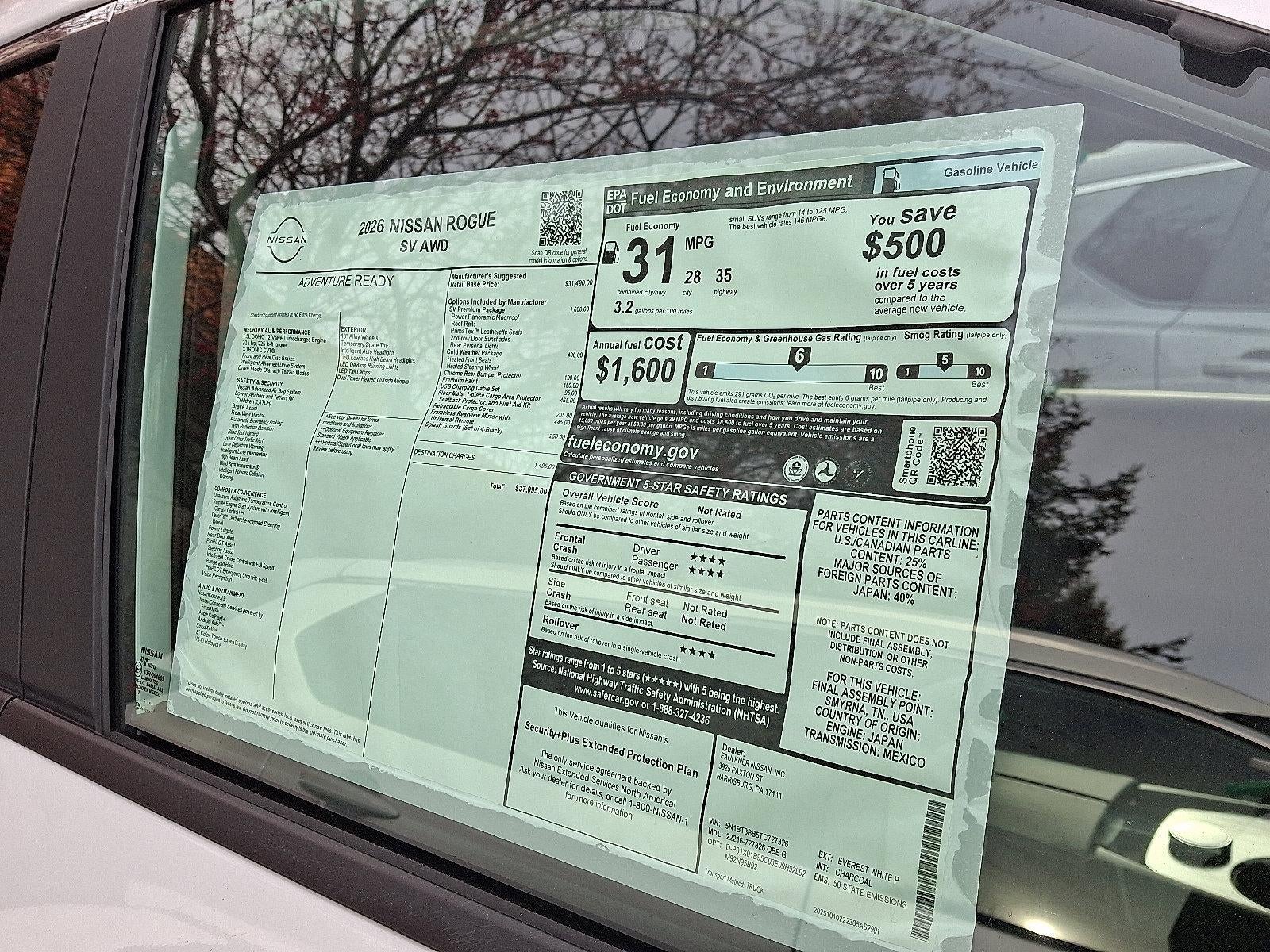 2026 Nissan Rogue SV 1.5L DOHC *Schedule a test Drive at your home or office*, AWD, 4-Wheel Disc Brakes, 6 Speakers, ABS brakes, Air Conditioning, Alloy wheels, AM/FM radio: Sirius, Apple CarPlay/Android Auto, Auto High-beam Headlights, Automatic temperature control, Black Splash Guards (set of 4), Brake assist, Bumpers: body-color, Chrome Rear Bumper Protector, Cloth Seat Trim with Patterned Inserts, Cold Weather Package, Delay-off headlights, Driver door bin, Driver vanity mirror, Dual front impact airbags, Dual front side impact airbags, Electronic Stability Control, Emergency communication system: NissanConnect Services, Floor Mats with 1-Piece Cargo Area Protector, Four wheel independent suspension, Frameless Rearview Mirror with Universal Remote, Front anti-roll bar, Front Bucket Seats, Front Center Armrest, Front dual zone A/C, Front reading lights, Fully automatic headlights, Heated door mirrors, Illuminated entry, Knee airbag, Leatherette Door Trim Inserts with Stitch, Low tire pressure warning, Occupant sensing airbag, Outside temperature display, Overhead airbag, Overhead console, Panic alarm, Panoramic Moonroof, Passenger door bin, Passenger vanity mirror, Power door mirrors, Power driver seat, Power Liftgate, Power steering, Power windows, Premium Paint, Prima-Tex Leatherette Seat Trim, Radio data system, Radio: AM/FM NissanConnect, Rear anti-roll bar, Rear Door Sunshades, Rear Personal Lights, Rear seat center armrest, Rear side impact airbag, Rear window defroster, Rear window wiper, Remote keyless entry, Retractable Cargo Cover, Silver Painted Roof Rails, Speed control, Speed-sensing steering, Speed-Sensitive Wipers, Split folding rear seat, Spoiler, Steering wheel mounted audio controls, SV Premium Package, Tachometer, Telescoping steering wheel, Tilt steering wheel, Traction control, Trip computer, USB Charging Cable Set, Variably intermittent wipers, Wheels: 18" Dark Painted Machine Finished Alloy, AWD.