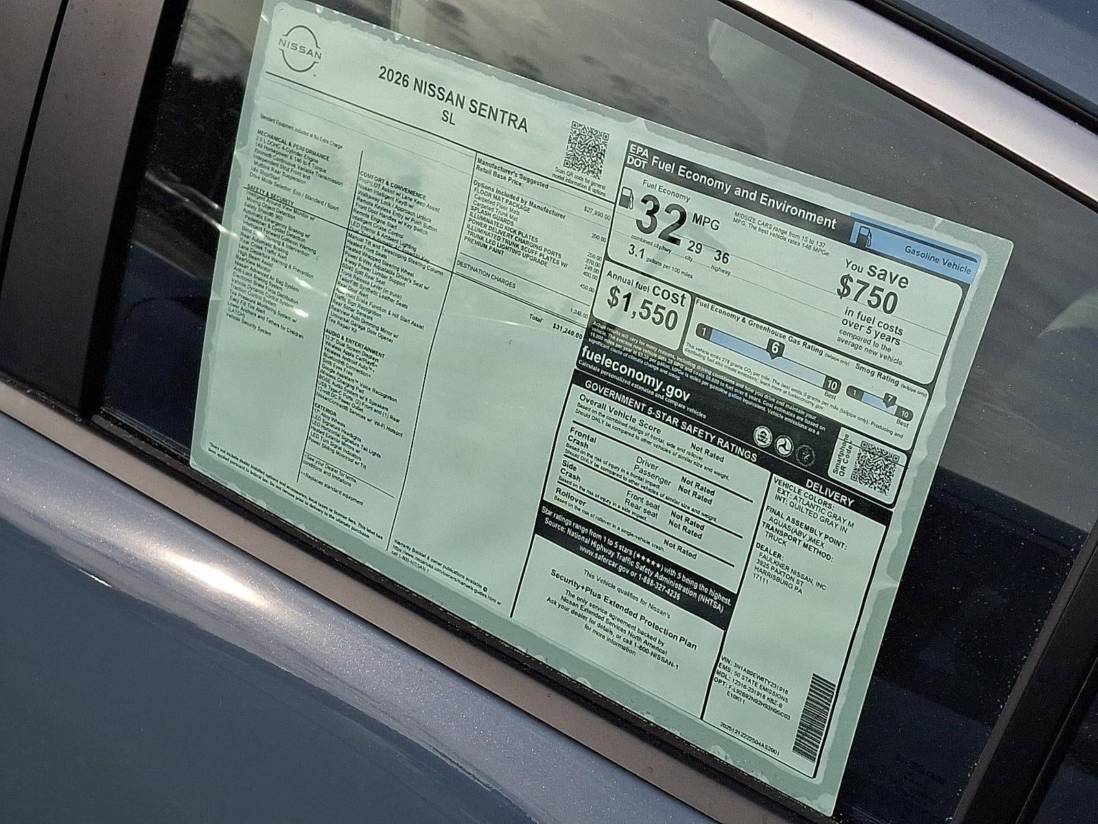 Recent Arrival! 2026 Nissan Sentra SL 2.0L I4 DOHC *Schedule a test Drive at your home or office*, CVT with Xtronic, Quilted Gray Artificial Leather, 17" Machined Alloy Wheels, 4-Wheel Disc Brakes, 8 Speakers, ABS brakes, Air Conditioning, Alloy wheels, AM/FM radio: Sirius, Auto High-beam Headlights, Auto-dimming Rear-View mirror, Automatic temperature control, Body Colored Splash Guards (4-Piece), Brake assist, Bumpers: body-color, Delay-off headlights, Driver door bin, Driver vanity mirror, Dual front impact airbags, Dual front side impact airbags, Electronic Stability Control, Emergency communication system: NissanConnect(R) Services powered by SiriusXM(R), Floor Mat Package, Four wheel independent suspension, Front anti-roll bar, Front Bucket Seats, Front Center Armrest, Front dual zone A/C, Front reading lights, Fully automatic headlights, Garage door transmitter, Heated door mirrors, Heated Front Bucket Seats, Heated front seats, Heated steering wheel, Illuminated entry, Illuminated Kick Plates, Illuminated Trunk Scuff Plate, Knee airbag, Leather steering wheel, Low tire pressure warning, Occupant sensing airbag, Outside temperature display, Overhead airbag, Overhead console, Panic alarm, Passenger door bin, Passenger vanity mirror, Power Delivery Charging Ports, Power door mirrors, Power driver seat, Power moonroof, Power steering, Power windows, Premium Paint, Quilted TailorFit Synthetic Leather Seat Trim, Radio data system, Radio: AM/FM with RDS/MP3, Rear anti-roll bar, Rear seat center armrest, Rear side impact airbag, Rear window defroster, Remote keyless entry, Security system, Speed control, Speed-sensing steering, Split folding rear seat, Steering wheel mounted audio controls, Tachometer, Telescoping steering wheel, Tilt steering wheel, Traction control, Trip computer, Turn signal indicator mirrors, Variably intermittent wipers, Wireless Apple CarPlay/Wireless Android Auto, CVT with Xtronic, Quilted Gray Artificial Leather.