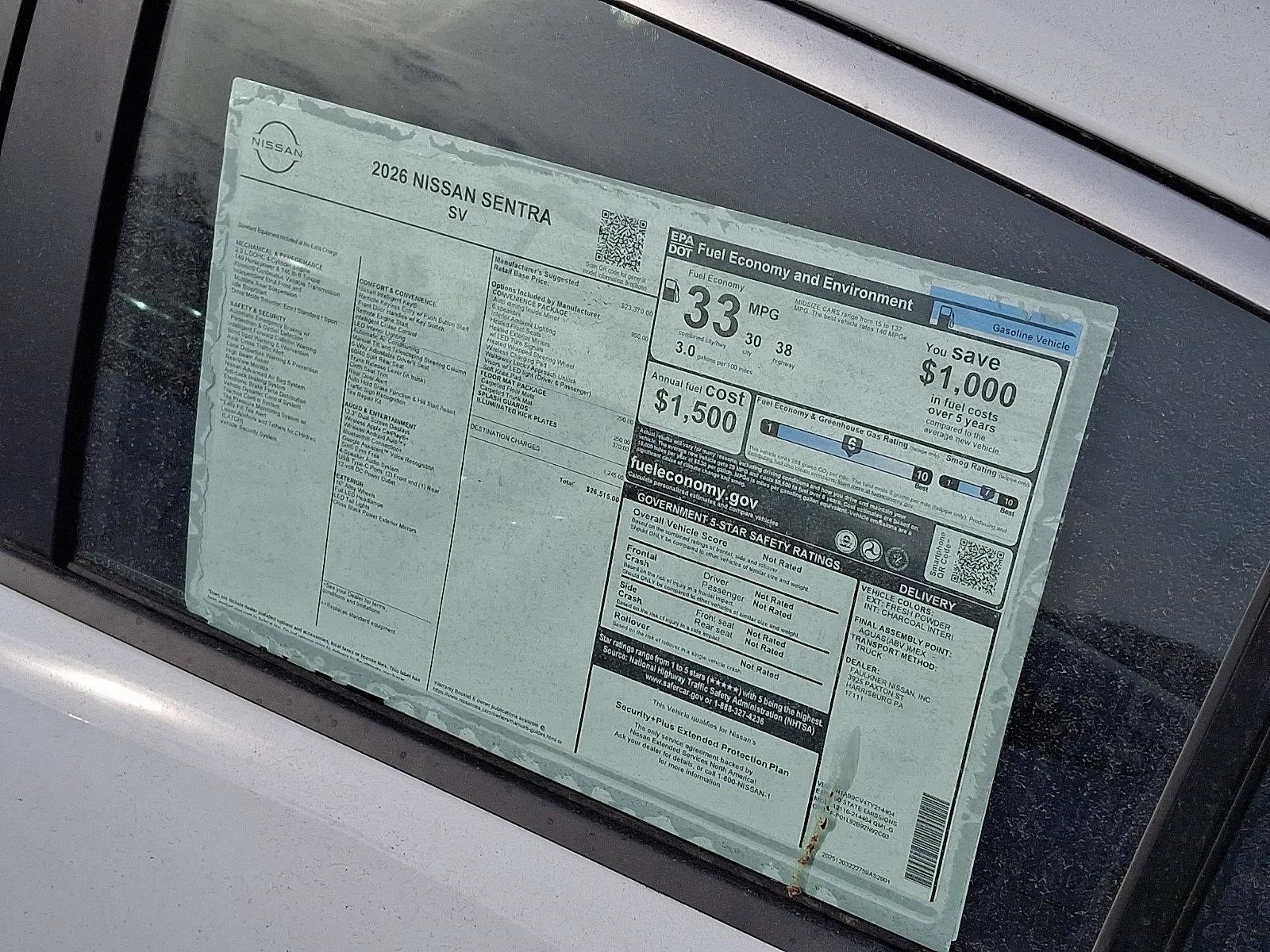 2026 Nissan Sentra SV 2.0L I4 DOHC *Schedule a test Drive at your home or office*, CVT with Xtronic, Charcoal Cloth, 16" Machined Alloy Wheels, 4 Speakers, 4-Wheel Disc Brakes, 6 Speakers, ABS brakes, Air Conditioning, Alloy wheels, AM/FM radio: Sirius, Ambient Lighting, Auto Diming Inside Mirror, Auto High-beam Headlights, Automatic temperature control, Body Colored Splash Guards (4-Piece), Brake assist, Bumpers: body-color, Delay-off headlights, Driver door bin, Driver vanity mirror, Dual front impact airbags, Dual front side impact airbags, Electronic Stability Control, Floor Mat Package, Four wheel independent suspension, Front anti-roll bar, Front Bucket Seats, Front Center Armrest, Front reading lights, Fully automatic headlights, Heated Exterior Mirrors, Heated Front Seats, Heated Steering Wheel, I-Key with Approach Unlock All Plus Walk Away Lock, Illuminated entry, Illuminated Kick Plates, Knee airbag, Low tire pressure warning, Occupant sensing airbag, Outside temperature display, Overhead airbag, Overhead console, Panic alarm, Passenger door bin, Passenger vanity mirror, Power door mirrors, Power steering, Power windows, Premium Cloth Seat Trim, Radio data system, Radio: AM/FM with RDS/MP3, Rear anti-roll bar, Rear side impact airbag, Rear window defroster, Remote keyless entry, Security system, Soft Knee Pad, Speed control, Speed-sensing steering, Split folding rear seat, Steering wheel mounted audio controls, SV Convenience Package, Synthetic Leather Steering Wheel, Tachometer, Telescoping steering wheel, Tilt steering wheel, Traction control, Trip computer, Variably intermittent wipers, Visor DR/AS w/LED Light, Wireless Apple CarPlay/Wireless Android Auto, Wireless Charging For Personal Devices, CVT with Xtronic, Charcoal Cloth.