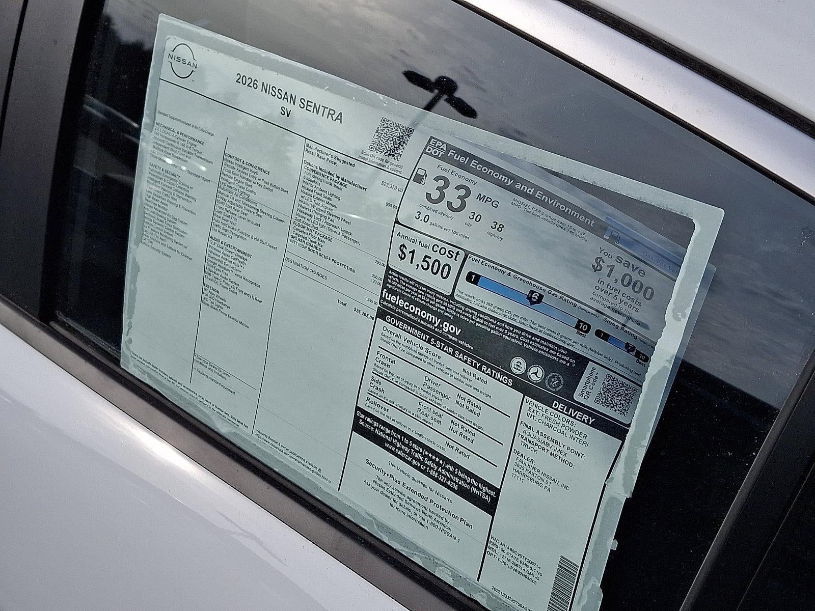 2026 Nissan Sentra SV 2.0L I4 DOHC *Schedule a test Drive at your home or office*, CVT with Xtronic, Charcoal Cloth, 16" Machined Alloy Wheels, 4 Speakers, 4-Wheel Disc Brakes, 6 Speakers, ABS brakes, Air Conditioning, Alloy wheels, AM/FM radio: Sirius, Ambient Lighting, Auto Diming Inside Mirror, Auto High-beam Headlights, Automatic temperature control, Body Colored Splash Guards (4-Piece), Brake assist, Bumpers: body-color, Delay-off headlights, Driver door bin, Driver vanity mirror, Dual front impact airbags, Dual front side impact airbags, Electronic Stability Control, Floor Mat Package, Four wheel independent suspension, Front anti-roll bar, Front Bucket Seats, Front Center Armrest, Front reading lights, Fully automatic headlights, Heated Exterior Mirrors, Heated Front Seats, Heated Steering Wheel, I-Key with Approach Unlock All Plus Walk Away Lock, Illuminated entry, Interior Door Scuff Protection, Knee airbag, Low tire pressure warning, Occupant sensing airbag, Outside temperature display, Overhead airbag, Overhead console, Panic alarm, Passenger door bin, Passenger vanity mirror, Power door mirrors, Power steering, Power windows, Premium Cloth Seat Trim, Radio data system, Radio: AM/FM with RDS/MP3, Rear anti-roll bar, Rear side impact airbag, Rear window defroster, Remote keyless entry, Security system, Soft Knee Pad, Speed control, Speed-sensing steering, Split folding rear seat, Steering wheel mounted audio controls, SV Convenience Package, Synthetic Leather Steering Wheel, Tachometer, Telescoping steering wheel, Tilt steering wheel, Traction control, Trip computer, Variably intermittent wipers, Visor DR/AS w/LED Light, Wireless Apple CarPlay/Wireless Android Auto, Wireless Charging For Personal Devices, CVT with Xtronic, Charcoal Cloth.
