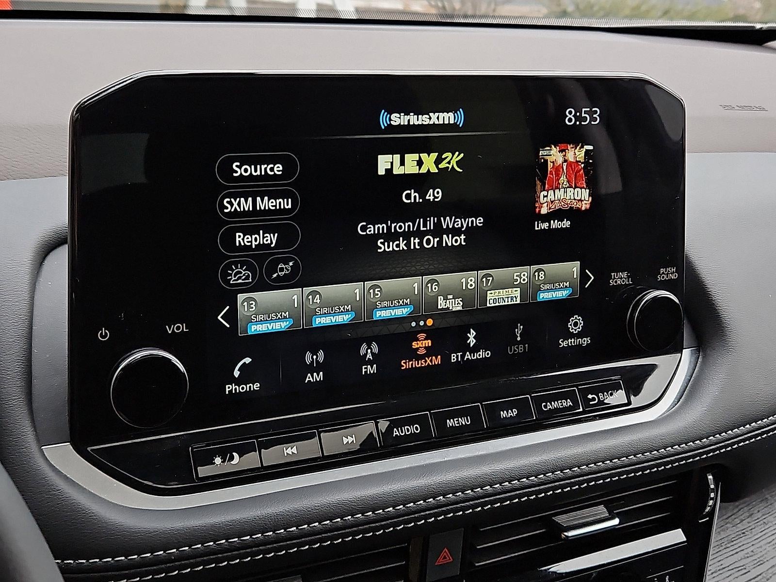 - Radio: AM/FM NissanConnect w/Navigation -inc: NissanConnect featuring Apple CarPlay and Android Auto, 9" color HD display w/multi-touch control, Bluetooth®, WiFi hotspot, Nissan door-to-door navigation w/3D building graphics, satellite imagery featuring online POI search and online premium traffic information, 5 years complimentary map updates, wireless Apple CarPlay, SiriusXM Traffic, SiriusXM Travel Link, Alexa built-in and voice recognition